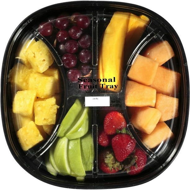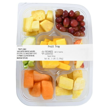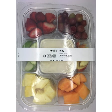 Walmart Fruit Tray and Kids Tray. Medium Serves 15-18 Price 32. Walmart Fruit Tray Serves 8-10 Delicious cuts of seasonally-freshfruits such as pineapple strawberriesmango cantaloupe red grapes redand green apples.