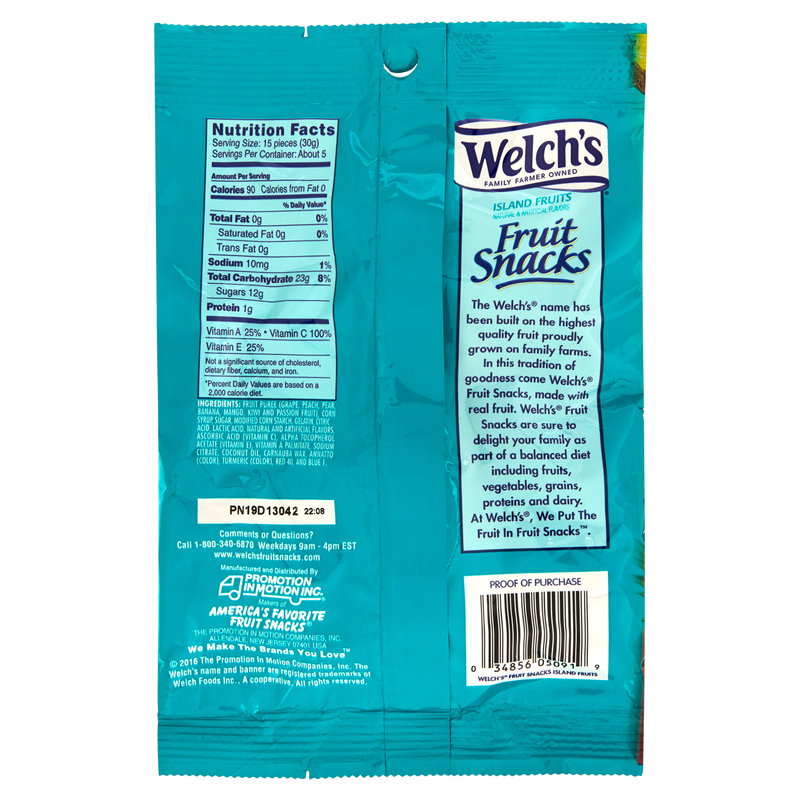Welch's island fruit snacks ingredients. 5 rows Welchs Island Fruit Snacks. 10 - 9 oz bags. Fruit Puree grape peach pear banana mango kiwi and passion fruit water corn syrup sugar inulin from chicory root modified corn starch gelatin citric acid lactic acid ascorbic acid vitamin C natural and artificial flavors alpha tocopherol acetate vitamin E vitamin A palmitate sodium citrate coconut oil carnauba wax annatto color turmeric color red 40 and blue 1.