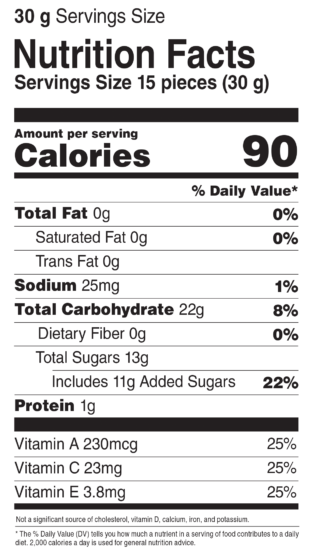 Fruit puree grape peach pear banana mango kiwi passion fruit strawberry grapefruit and pineapple corn syrup sugar modified corn starch gelatin citric acid ascorbic acid vitamin C alpha tocopherol acetate vitamin E vitamin A palmitate sodium citrate natural flavors palm oil coconut oil carnauba wax annatto color turmeric color and fruit and vegetable juice color. Available in over 10 varieties all featuring Fruit as the 1st Ingredient with 100 DV Vitamin C 25 DV Vitamins A E No Preservatives Fat Free Gluten Free and more. Strawberry-Banana Tropical Punch Pink.